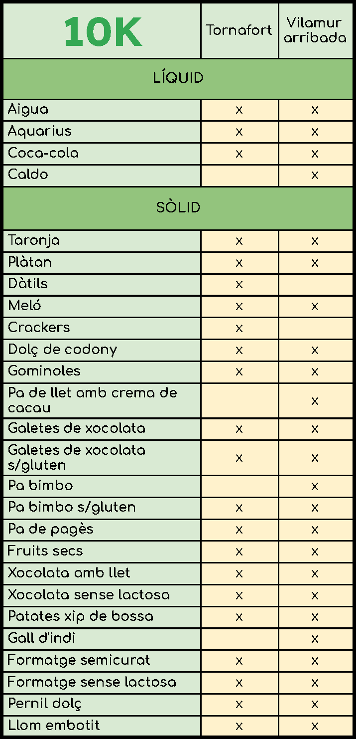 Tots els avituallaments de la cursa han estat pensats a fi de garantir opcions diverses per a tothom i també que algunes siguin adequades i respectuoses amb les al·lèrgies o intoleràncies i les opcions nutricionals de cadascun dels participants.