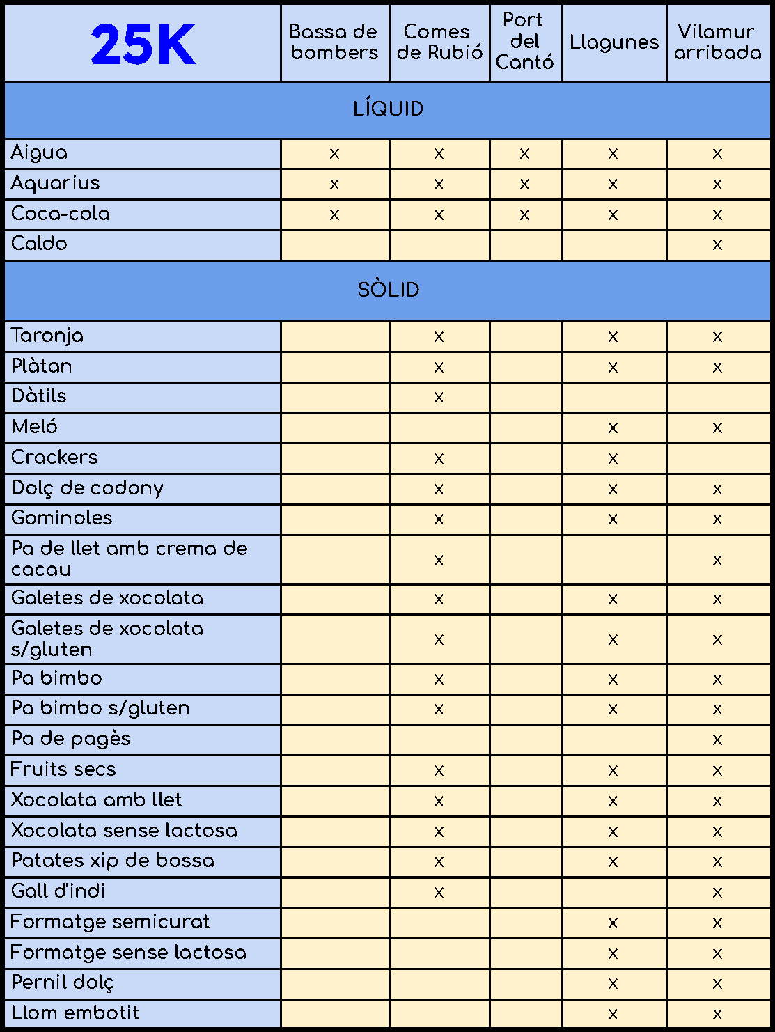 Tots els avituallaments de la cursa han estat pensats a fi de garantir opcions diverses per a tothom i també que algunes siguin adequades i respectuoses amb les al·lèrgies o intoleràncies i les opcions nutricionals de cadascun dels participants.